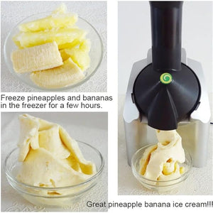 - The unit combines frozen bananas and any additional fruit or chocolate and instantly churns the ingredients to produce a treat with the texture of frozen yogurt or soft-serve ice cream, but without the additional fat, sugar, or preservatives.